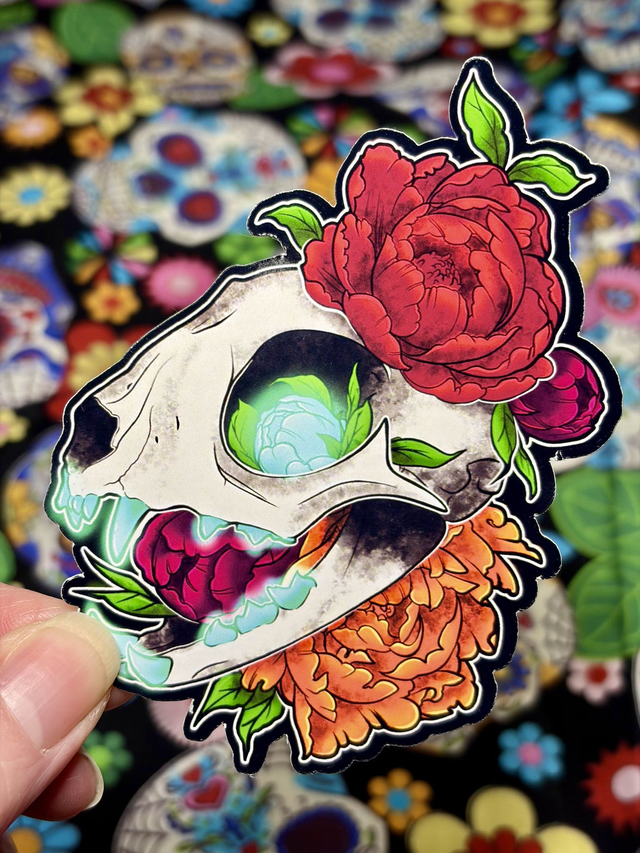 Feline skull Jumbo sticker with glowing flora designs